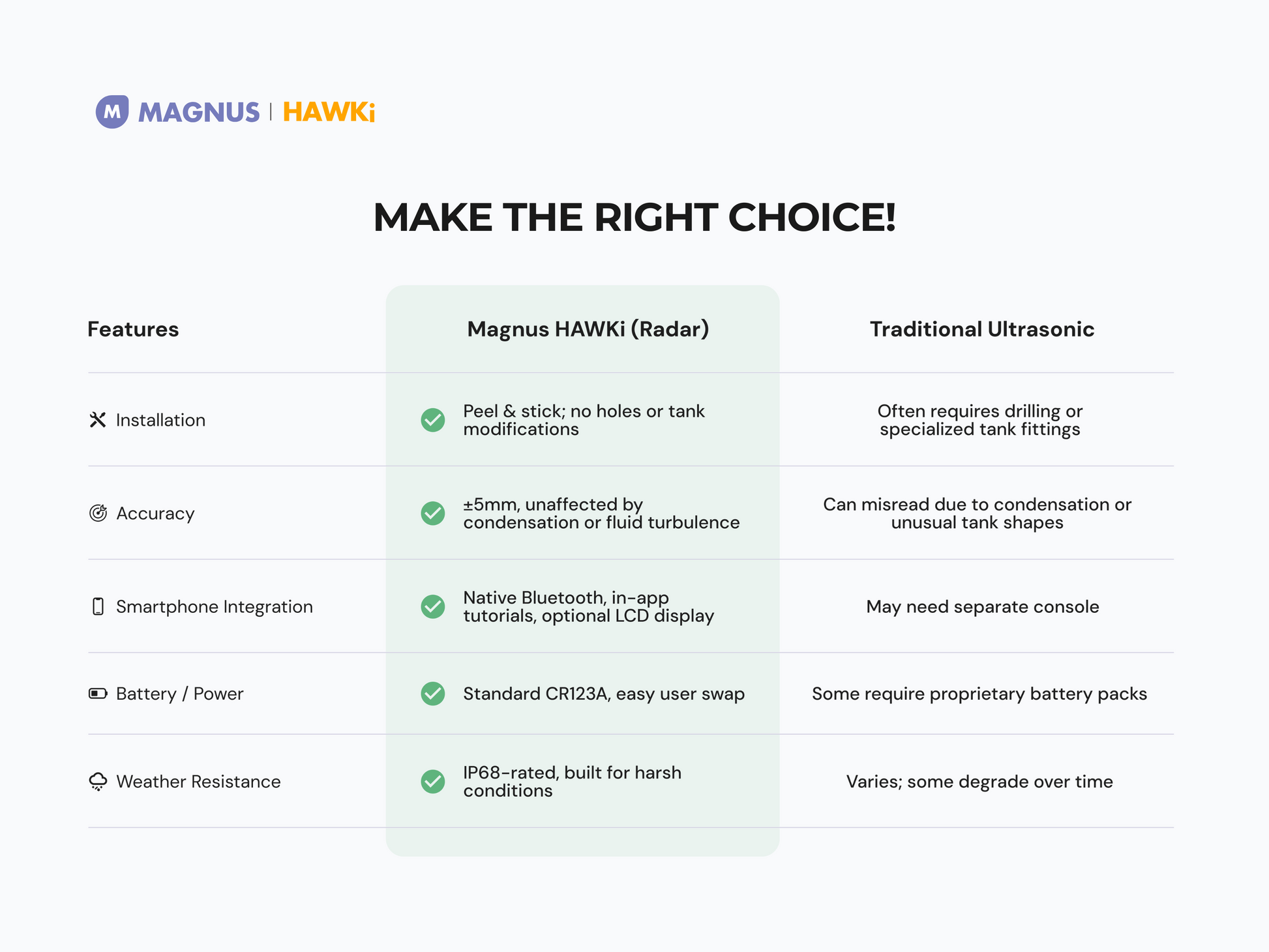 Meet the award-winning Magnus HAWKi: a self-installable, advanced radar-based tank monitor providing precise, real-time insights for fuel, water, and various liquid or solid materials. Engineered for simplicity, HAWKi requires no drilling and connects seamlessly with your smartphone, making tank monitoring both reliable and effortless.